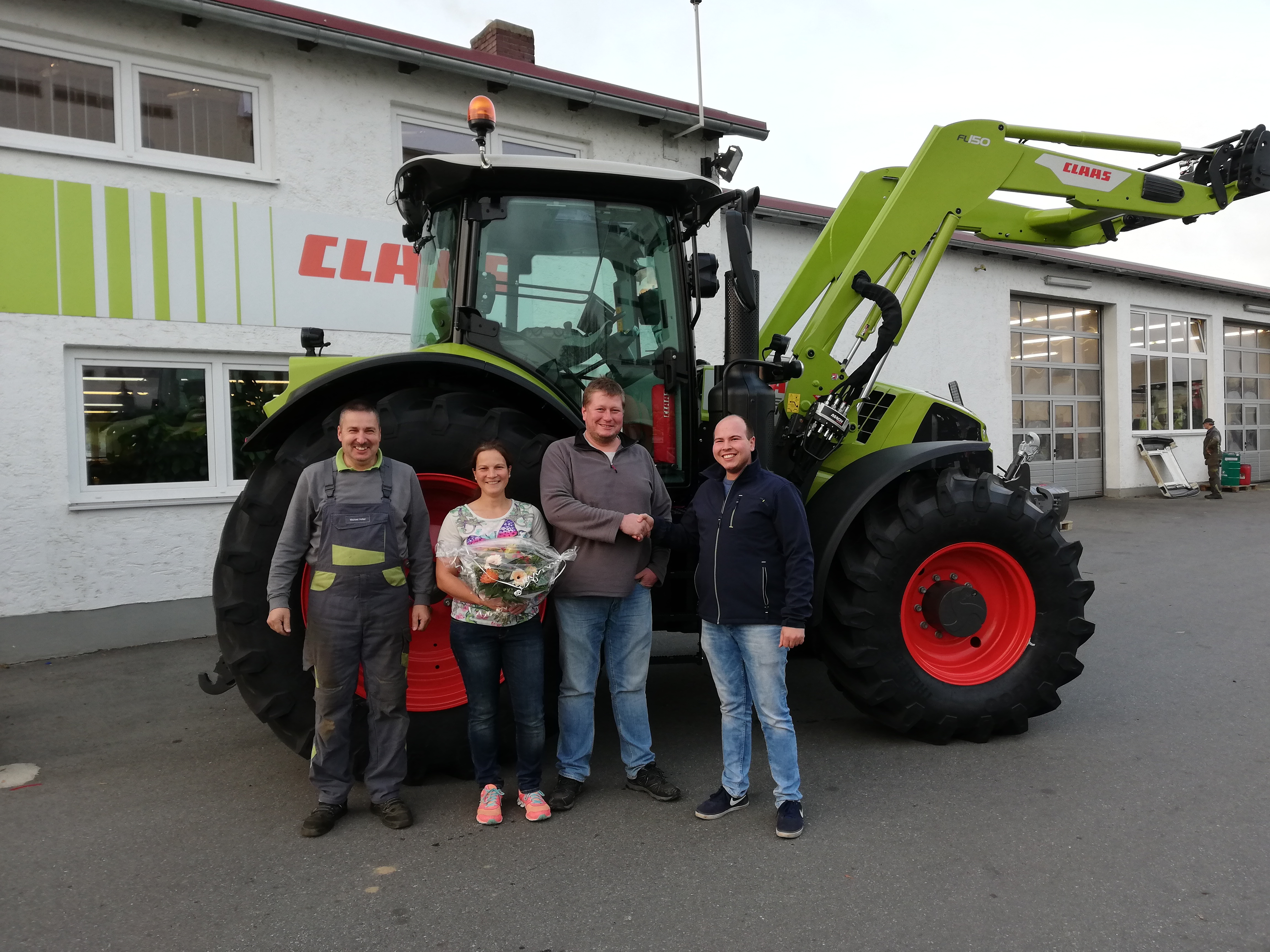 Hier zu sehen der CLAAS Cham Werkstattleiter Michael Vetter, Andreas Schebler mit seiner Ehefrau und mit dem Verkaufsberater Christoph Riederer.