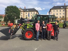 Wir gratulieren unserem Kunden Roland Heinlein aus Seßlach zum neuen Schlepper CLAAS AXOS 330 CL. (Bild: v.l. CLAAS Verkaufsberater Andreas Behr, Roland Heinlein, CLAAS Werkstattgeselle Florian Menzel und CLAAS Werkstattleiter Swen Och)
